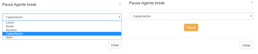 El agente podra colocarse en Pausa o break en cualquier momento, solo debe presionar el botón pausa y seleccionar el motivo que puede ser almuerzo, lunch, break, etc